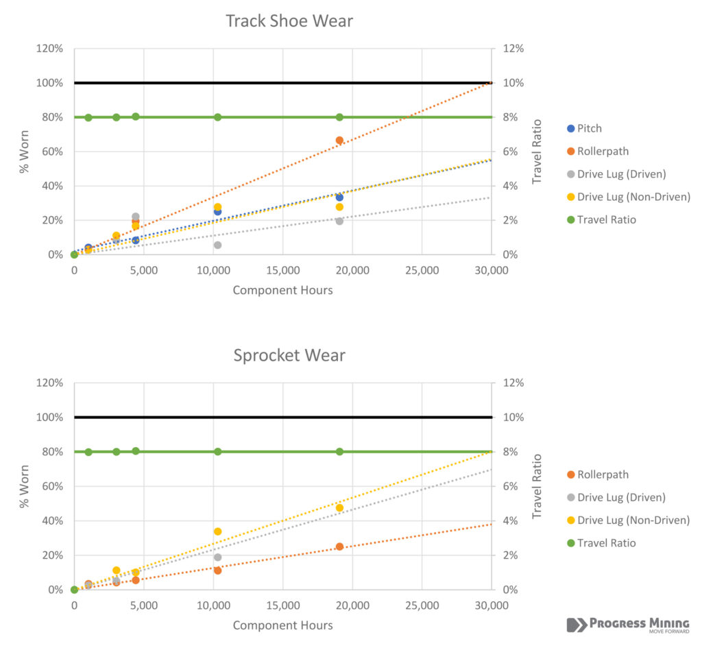 Above: Charts extracted from the Condition Monitoring Report on the Hitachi® EX5600 show the progression of wear on the tracks and sprockets, based on inspections carried out at multiple stages throughout the component’s service life.